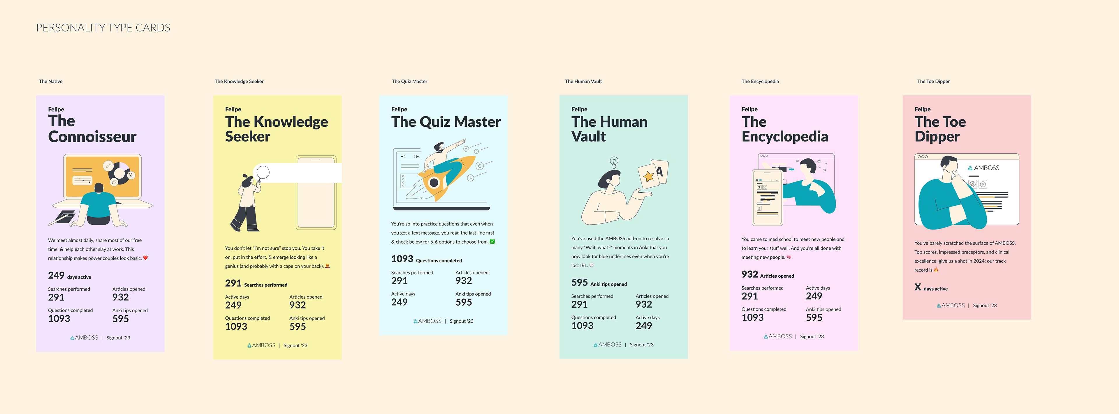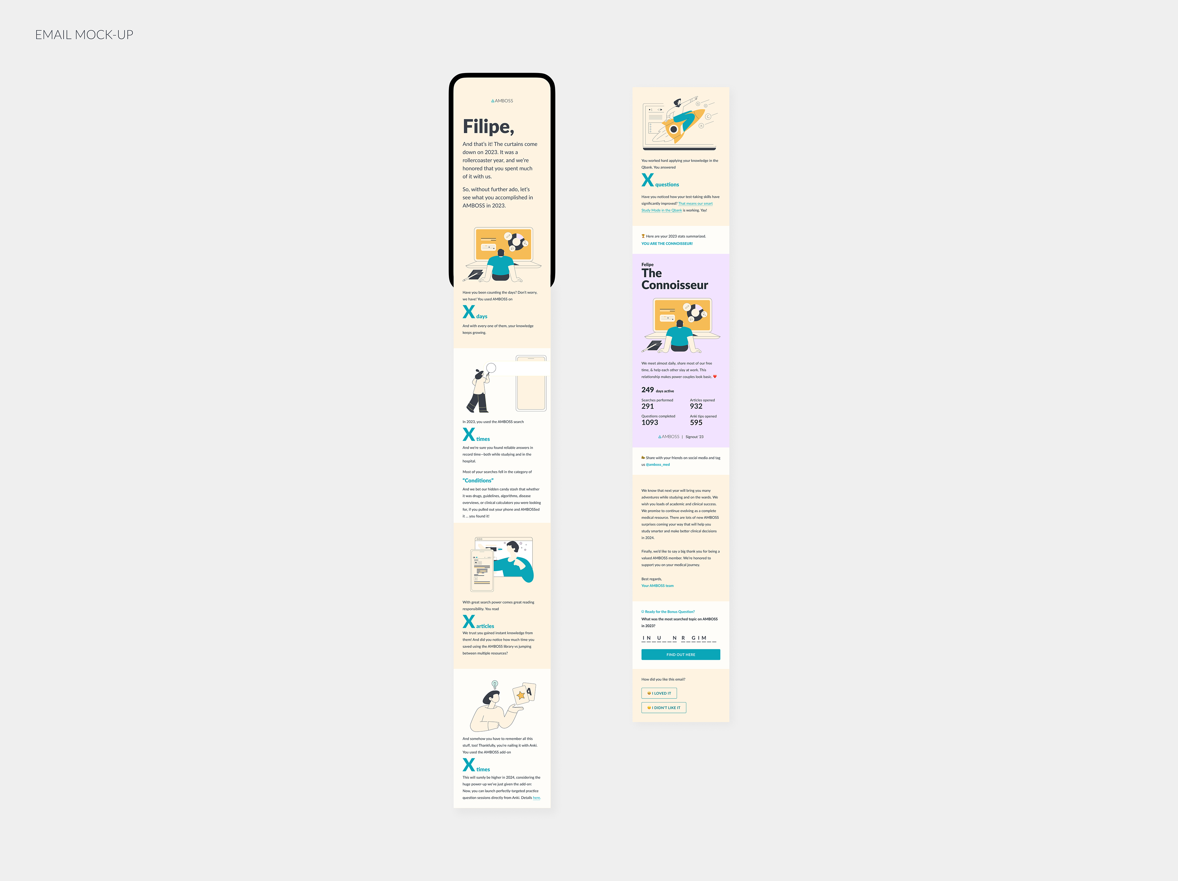 Designed a high-performing cross-platform CRM campaign featuring “AMBOSS Wrapped” and personalized personality-type cards to re-engage paid and inactive users. Leveraged tailored illustrations and a strategically crafted color palette to resonate with the target audience, delivering a visually compelling and on-brand experience. Recognized as one of the best-performing CRM campaigns, it boosted retention, strengthened brand affinity, and drove renewed engagement.
